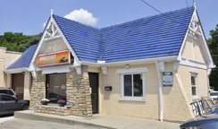 | This former station may have been built in the mid-1930s. The blue porcelain enamel roof tiles suggest Pure Oil but the building is not a design that I recognize. [map] |