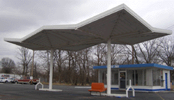 This former Mobil station canopy was still in use at a 7-Eleven station and convenience store when this photo was taken in 2011. By 2014, the 7-11 had closed and the canopy was gone. For more about these 1960s canopies and pumps, see this page.