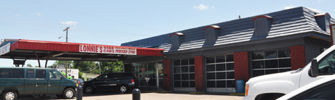 | I believe this former station was originally a Texaco from the late 1950s. By 2018, the building had been painted gray and red. The windows have been covered up and the building now houses Lonnie's Used Cars. [map] |