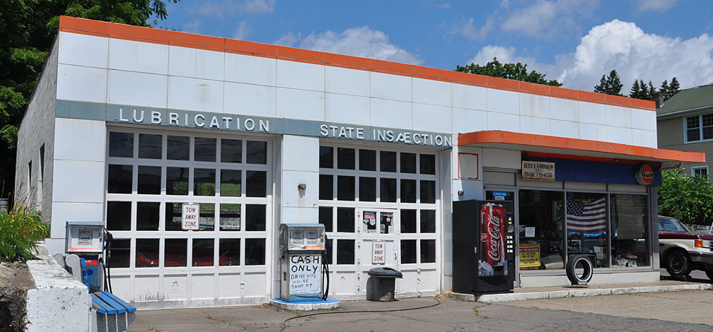 Alex's Gulf station no longer sells gas but still performs repairs. This may have been built as an Esso station. [map]