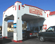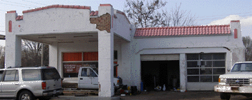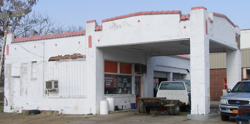 This former Gulf station was built in the 1930s as Layne's Gulf station. The bay building at the left was built in 1938 as a radio shop. The building housed A-One Automotive when these photos were taken in 2005. The building now houses a hair salon and spa. [vintage photo thanks Darryl Grant] [map]