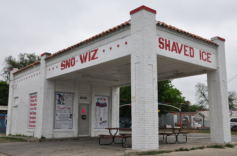 | This former Gulf station now houses the Sno-Wiz ice cream and food stand. The building had been painted blue by 2016 and the roof had been altered. [map] |