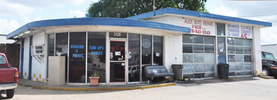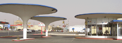 | This former Fina station now houses Alex Auto Repair. There might have been more than one mushroom canopy originally. [map] |