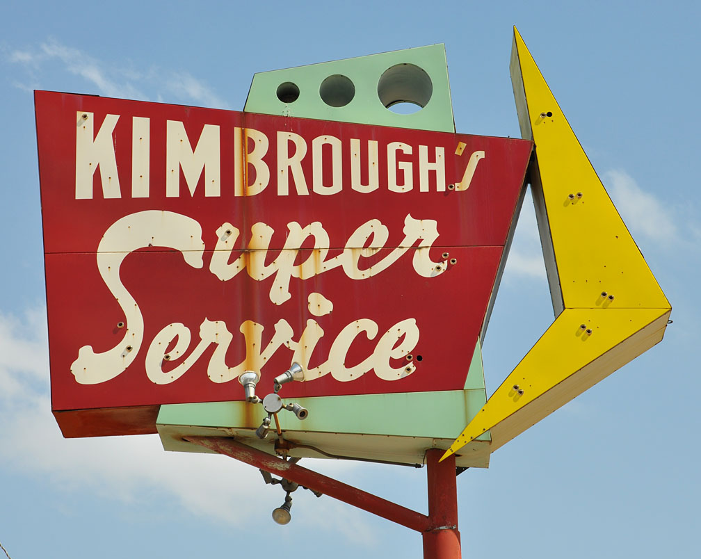 | Kimbrough's Super Service was built in 1955. It has been vacant for many years. In 2022, the sign was removed and moved to Cook's Garage in Lubbock, TX. By 2024, the gas pumps had been removed. [map] |
