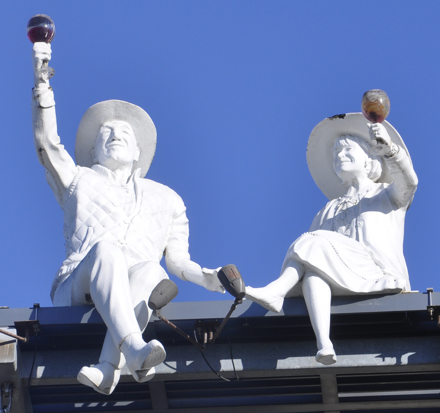 This 8-foot-tall, high-density foam sculpture of Robert and Margrit Mondavi was created by Gordon Huether. It is installed over the entrance to the CIA (The Culinary Institute of America) at Copia. The Mondavis founded and funded Copia as a center for wine, food, and the arts. Their winery was built in 1966 and is still operating in Oakville, CA. For more, see this website. [map] |