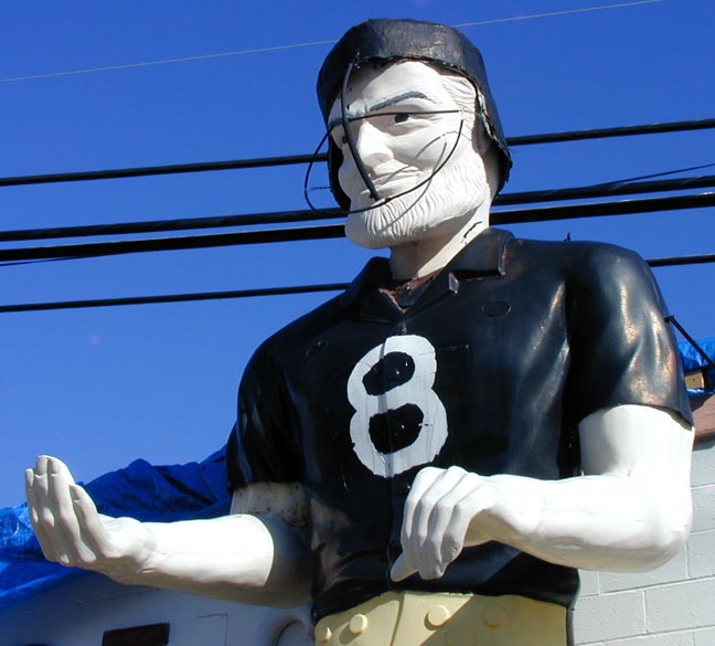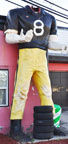 | This Paul Bunyan statue was originally located at Myers Tire Supply in Pittsburgh, PA. When the statue was moved to Greensburg in 1970, the Westmoreland Tire Co. transformed him into the football player, Jack Lambert #58. The statue's beard was painted over to look like skin. Later, the statue was repainted as other Pittsburgh Steelers, lastly, as #8 Tommy Maddox. In 2007, Lug Nuts moved into the building and restored the statue (two photos above middle). His helmet was removed, his beard was painted black and his skin was given a darker complexion. Since 2008, the statue's head has been missing. In 2021, the statue was repainted with a red shirt and blue pants. His head which had been in storage was repainted in 2022. It was reinstalled in 2023. [map] |