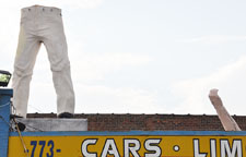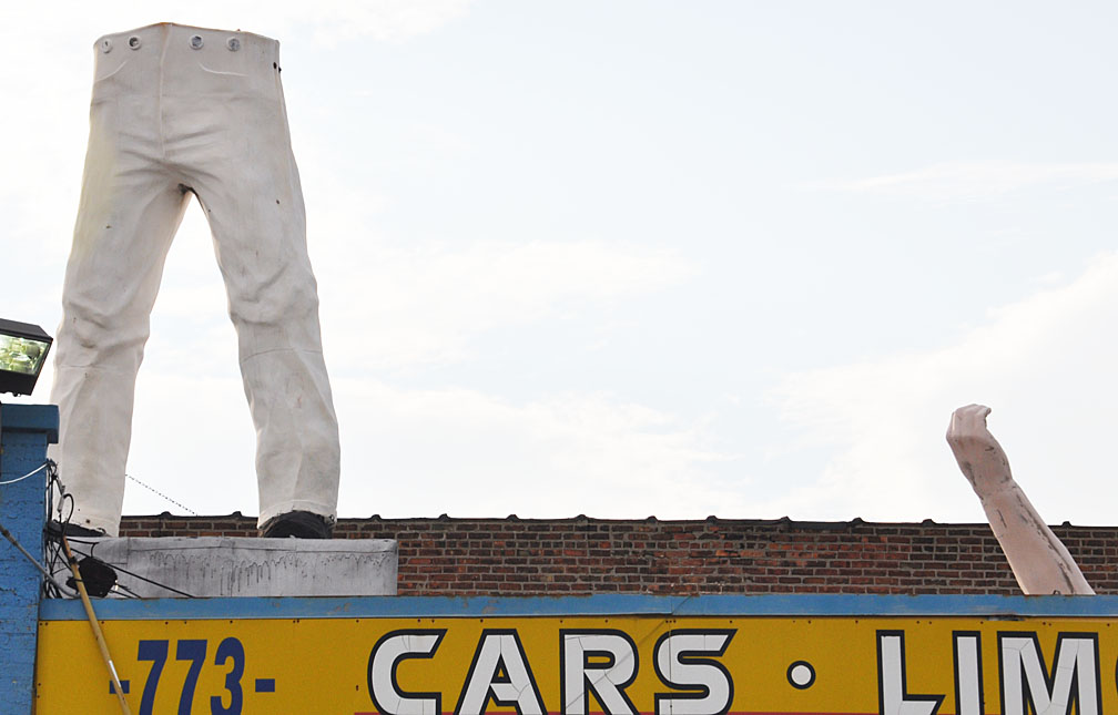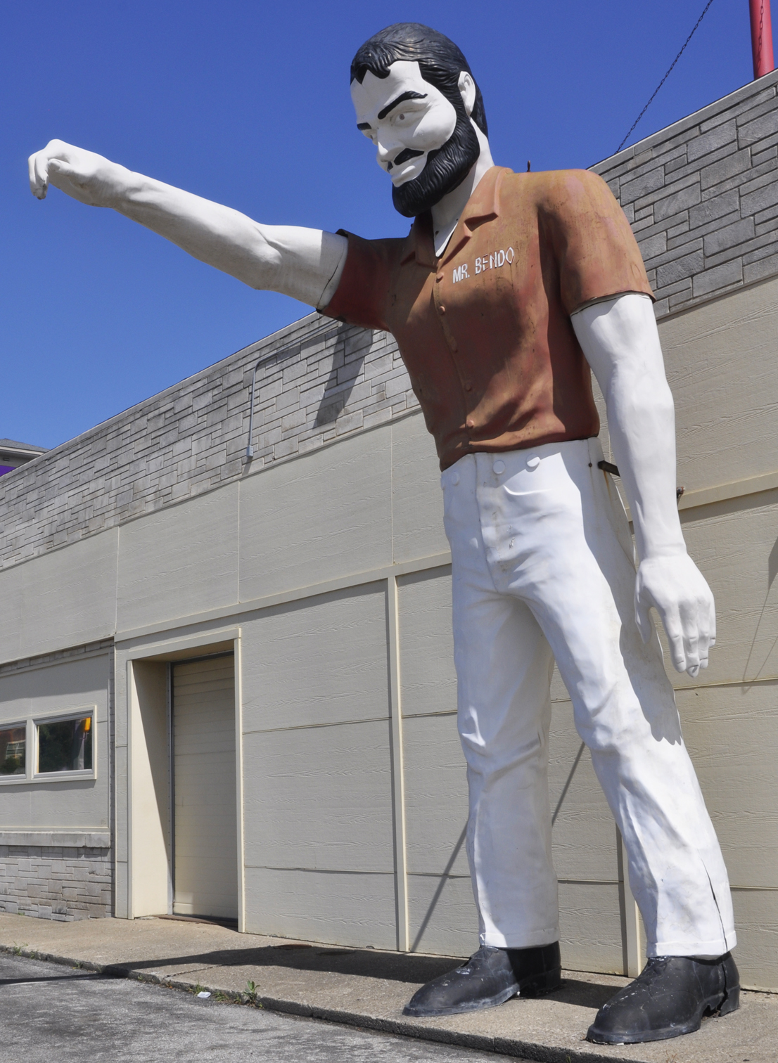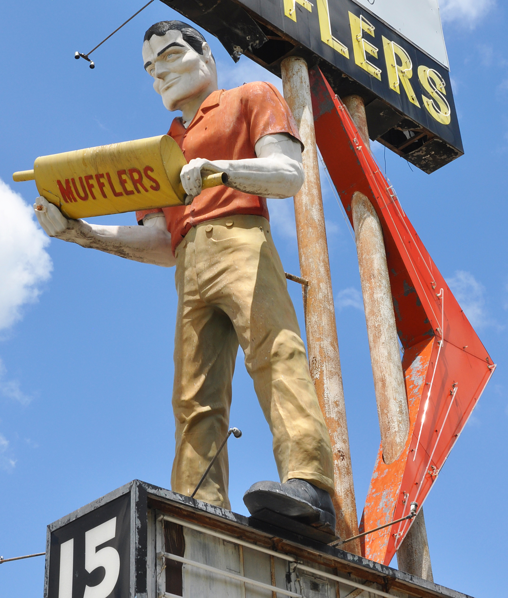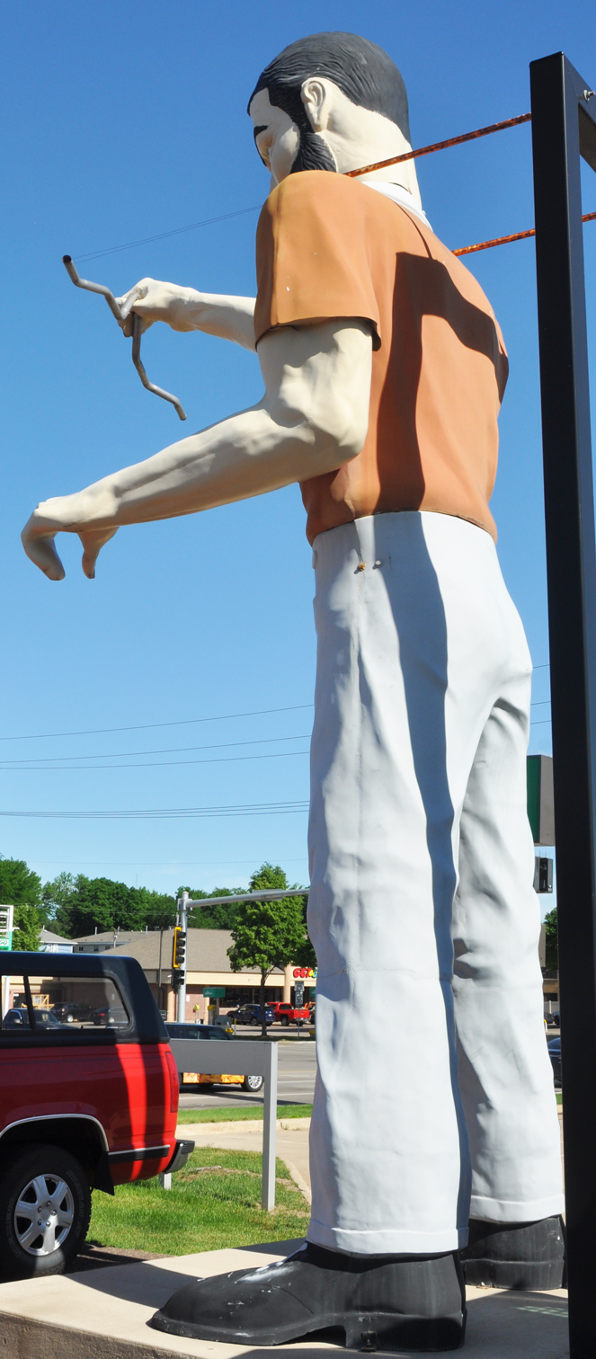 | This Mr. Bendo statue has been at Ralph's Mufflers since the 1960s. It was repainted around 2009. After International Fiberglass had closed, the owner made a mold from this statue and had two others produced for his other muffler shops. However, city zoning laws did not allow them to be displayed. The statues and mold remained in storage until they were sold to American Giants. The two statues are now installed in Dallas, GA and Cleveland, MO (both described below). [map] |