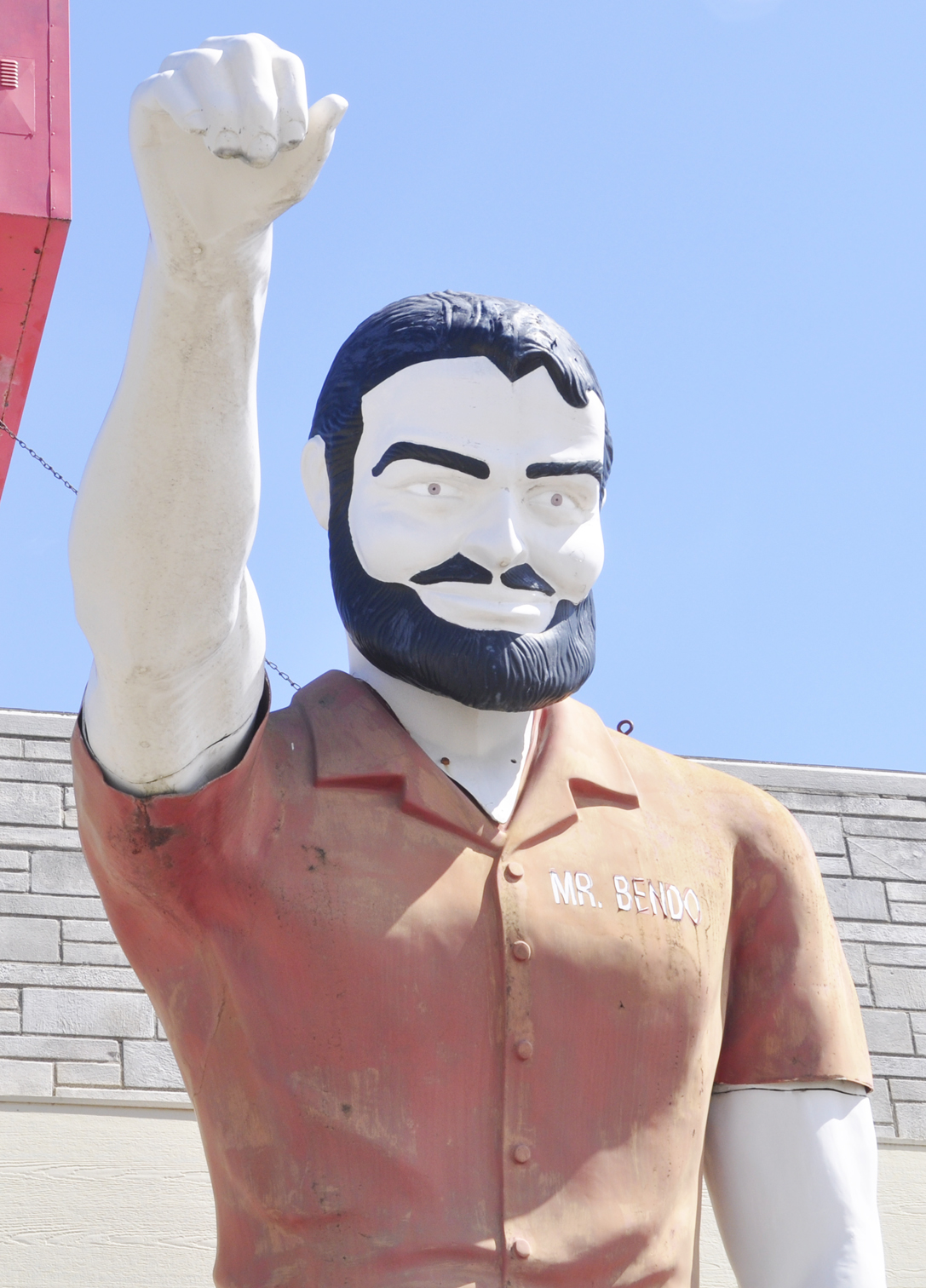 This Mr. Bendo statue was shipped by rail from California to Buck's Muffler in 1963. The statue's head was damaged in transit. It was installed headless in front of the shop for a few months until the head was repaired. In 1965, Buck's moved and the statue was brought along. Like the other original Mr. Bendo statues, he holds a tailpipe.