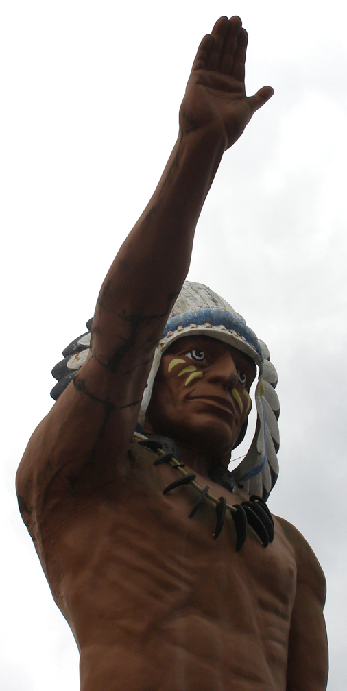 | This Indian statue pays tribute to Chief Wenonga. It has been here since at least the 1980s. This is the rarer style Indian statue with the turquoise necklace, fringed pants, loin cloth, and a broader face. [map] |