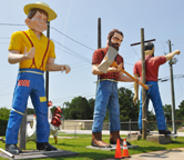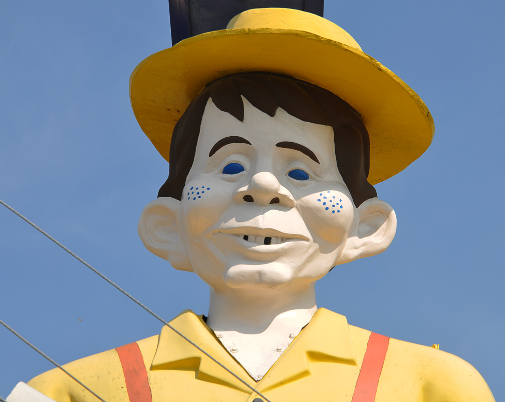 | This Mortimer Snerd statue stood in front of the Dogpatch gift shop in 2010. He was originally installed in the 1960s to promote Mortimer Snerd Golf. The statue held a mini golf club in his left hand. This is the only Mortimer Snerd known to have been produced with the right arm raised in the Indian model salute. The Mortimer Snerd statue was removed in 2013 due to safety concerns. In 2020, restoration of the Snerd statue began. It was reinstalled in 2024 just a little south of the original location. This statue stands directly across the street from an International Fiberglass Indian statue which was restored and reinstalled in 2016. For more, see these websites: 1, 2, 3, 4, 5, 6, and 7. [map] |