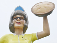| This Miss Uniroyal statue stands in front of Martha's Cafe. She held a plate with a burger and fries for many years. This statue was previously installed at the White Eagle Drive-Thru where she was a brunette. Before that, she was located at a gas station in town. In 2011, the statue was restored and repainted. The statue is a brunette again and she was given a diamond ring. There are no plans to reinstall the plate of food. The wristwatch is original. For more, see these websites: 1 and 2. [map] |