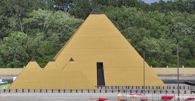 The 55-foot-tall Ramses Statue stands in front of the Gold Pyramid. The Pyramid was built from 1977-1978 as a six-story tall, 17,000 square foot private home with tours available. It contains a replica of King Tut's tomb. There is also a garage with three pyramids and a gift shop. After being closed for many years, the Gold Pyramid reopened in 2011 for tours and conference space. The Pyramid was damaged by a fire in 2018 and was rebuilt in 2022. It reopened in 2025 as an event venue. The columns at the entrance and gift shop are gone now. For more, see these websites: 1, 2, and 3. [map] |