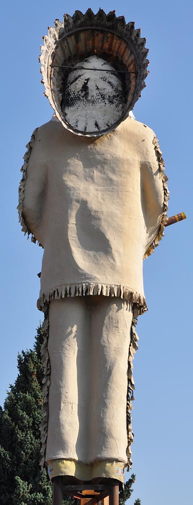 | The Indian statue in Salina stands in front of a Super 8 motel. The statue is meant to represent Chief Black Hawk. The original statue created in 1974 depicted an Egyptian slave. It was created by Steven Sewell Anderson. In 2004, the statue was converted into an Indian. These photos are from 2014. For more, see this website. [map] |