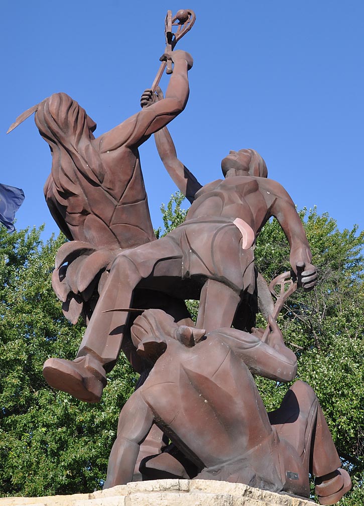 | The original sculpture of Ho-Chunk Indians playing lacrosse was installed in 1980. Later, it was replaced with a bronze version. There are now two of these statues in town. This sculpture was created by Elmer Petersen from Cor-Ten steel. In 2005, it was reported that a much larger, 20 foot tall, fiberglass version was being built. However, it doesn't seem like that ever happened. The sport of lacrosse was originally developed by Native Americans. For more, see this website. [map] |