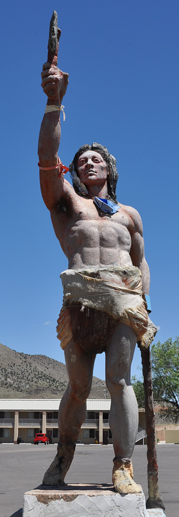 | The Ute Motel was probably built in the 1950s. This 18-foot-tall Indian statue was installed next to the sign in 1958. The statue was created by Albert Porter who also produced the dinosaur statues at the Utah Field House in Vernal. At some point, the top part of the sign was lost. The motel had been closed for many years. Around 2009, the Ashley Trading Post opened there and covered up the sign with their own. For more, see these websites: 1 and 2. [map] |