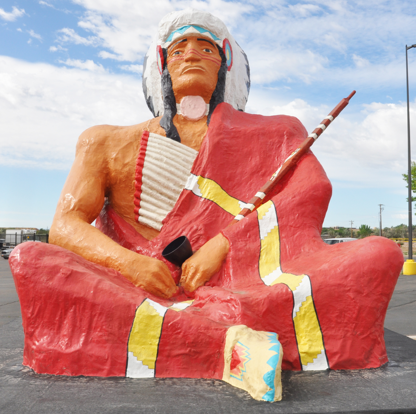 | This statue was originally installed in front of the Moqui Indian Trading Post which opened in 1969. There was originally a giant teepee in front of the building. The Indian statue was built by 1976 by Darrell Gardner. The building housed Lee Nails in later years but this statue remained. In 2018, the statue was restored and moved to the Ute Tribal Plaza in Fort Duchesne. For more, see these websites: 1 and 2. [map] |