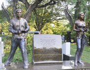 | This Lewis and Clark Trail of Discovery Monument is also known as "On the Trail of Discovery. The five bronze sculptures were installed in 2006 in front of the National Quilt Museum. They were created by George Lundeen and represent Meriwether Lewis, William Clark, an Indian man and girl, and Clark's dog Seaman. [map] |
