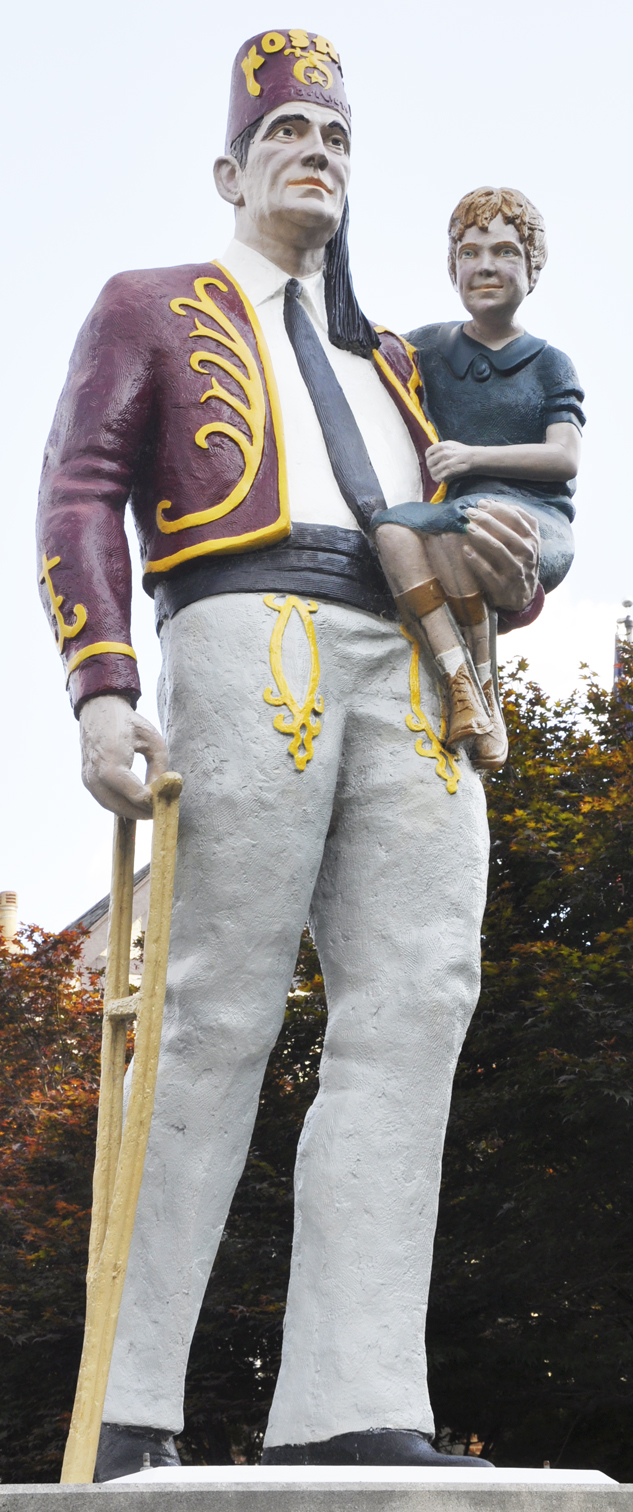 This Kosair Shriners statue is installed in front of the Kosair Shriners Temple. The Shriners organization has more than twenty Children's Hospitals around the country. These "Editorial Without Words" statues are installed elsewhere around the country, including these in Atlanta, GA, Las Vegas, NV, Knoxville, TN, and Richmond, VA. For more, see these websites: 1 and 2. [map]
