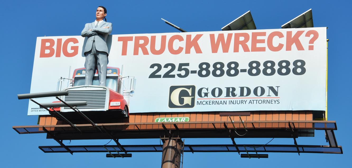 | This Billboard Man advertises for Gordon McKernan Injury Attorneys. The company has several other similar billboards around Baton Rouge but this is the only one with a statue. The statue is 16 feet tall and made of foam. It depicts Gordon McKernan. The statue was built and installed by Lamar Advertising in 2014. The company produced a similar billboard in 2020 in Pensacola, FL. For more, see this website. [map] |
