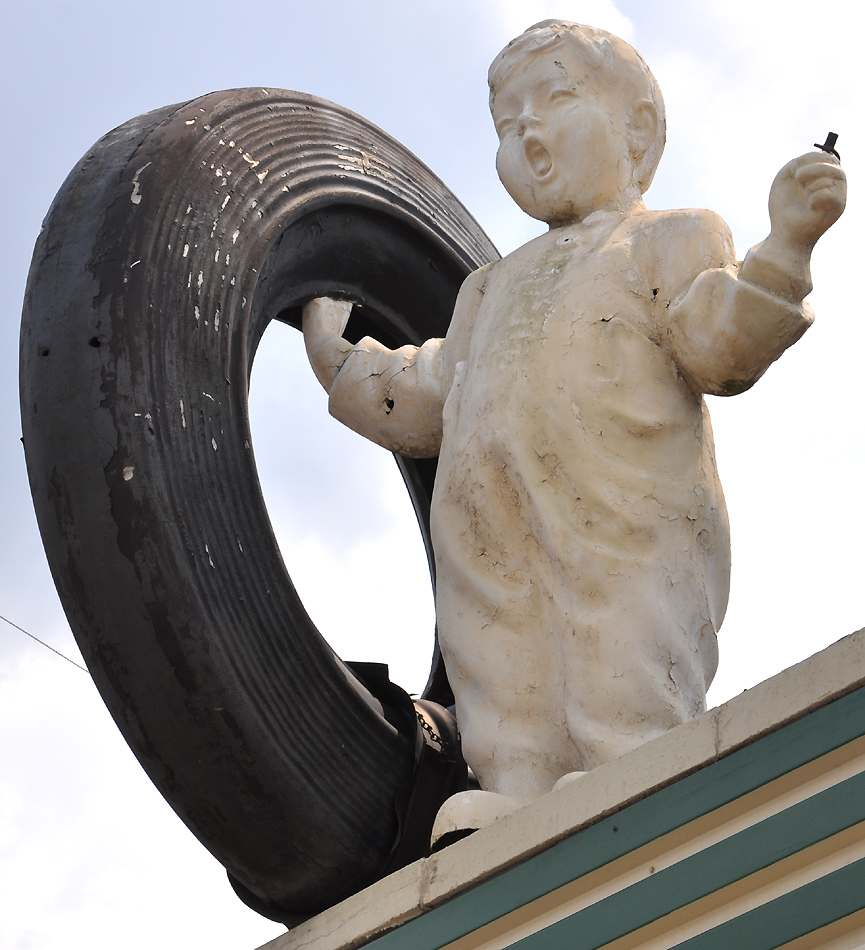 The Fisk Tire Boy statue in Detroit is installed on the roof of Warholak Tire Service. The other statue there is located inside the shop's office. [map] These statues originally held tires over their right shoulders and candles in their left hands. The character first appeared in advertising in 1914, using the slogan "Time to Re-Tire". These statues are probably from the 1950s. There are other examples in Pilot Mountain, NC, Scottsdale, AZ, and Bakersfield, CA. For more, see this website. |