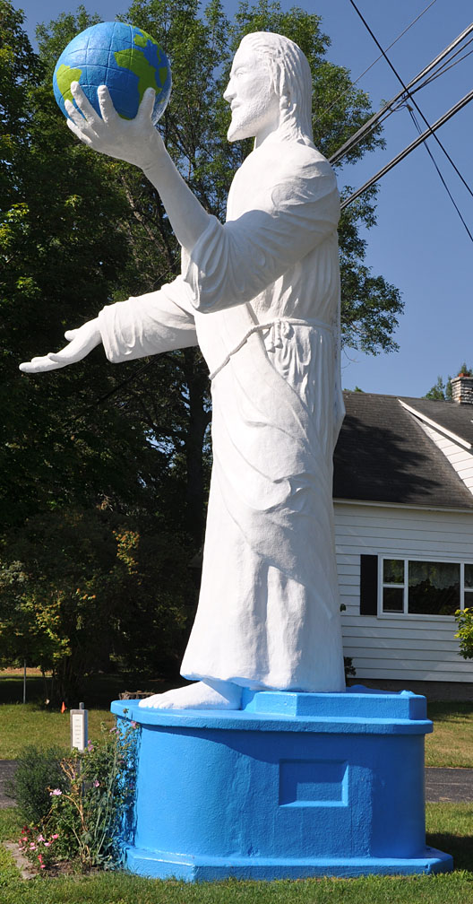 | This statue of Jesus Christ holding the Earth stands at the entrance to Dinosaur Gardens. Paul Domke built this statue, the dinosaurs, and the Paul Bunyan statue down the road. Domke was a devout Lutheran and believed that Christ was the master planner of the earth which included the dinosaurs. For more, see this website. [map] |