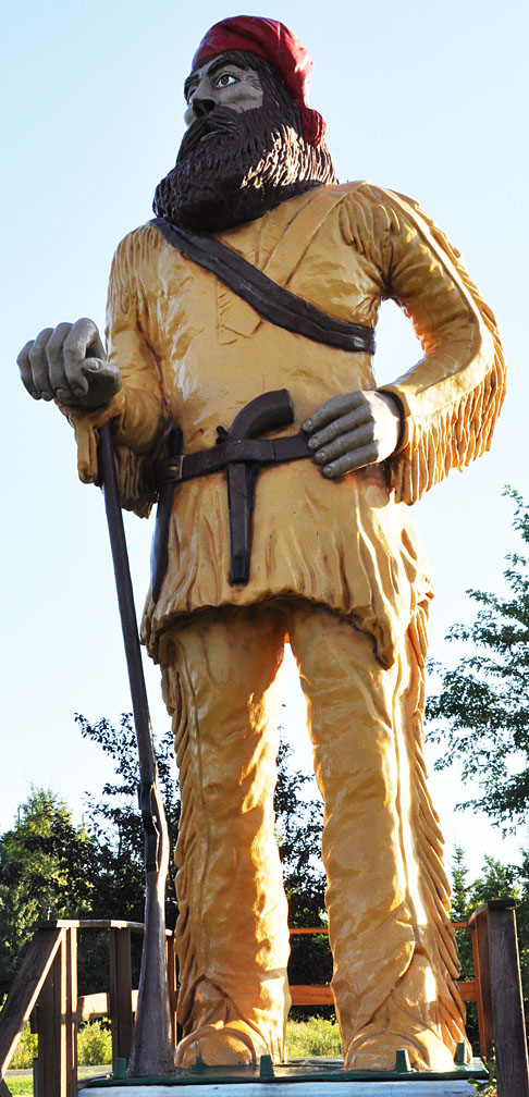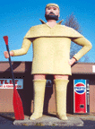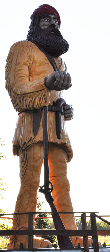 This statue of Pierre the Voyageur is 20 feet tall. The statue was installed in front of the Voyageur Motel in 1960. The statue wears a short jacket and boots - no pants. Originally, Pierre's eyes moved from left to right. His head also moved from side to side. Pierre spoke about the history of Voyageurs with the help of an employee broadcasting nearby. There was also a canoe in front of him to pose in for photo-taking. See this vintage postcard for what he looked like originally.