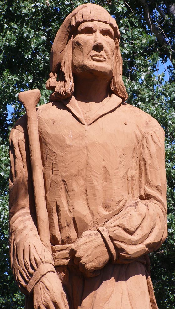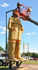 Around 2008, Pierre's canoe paddle was removed and the motel behind him was destroyed. In 2011, the statue was moved to the Earthwood Inn. The new owners restored the statue. Just after these photos in the bottom row above were taken, a new paddle was installed. Pierre's eyes glow red at night and he is illuminated with overhead lights. I believe he is "talking" again and there plans to get his head moving again. By 2012, a canoe was positioned next to him for photo-ops. For more, see these websites: 1 and 2. [top photo thanks Mark Comstock] [map] |