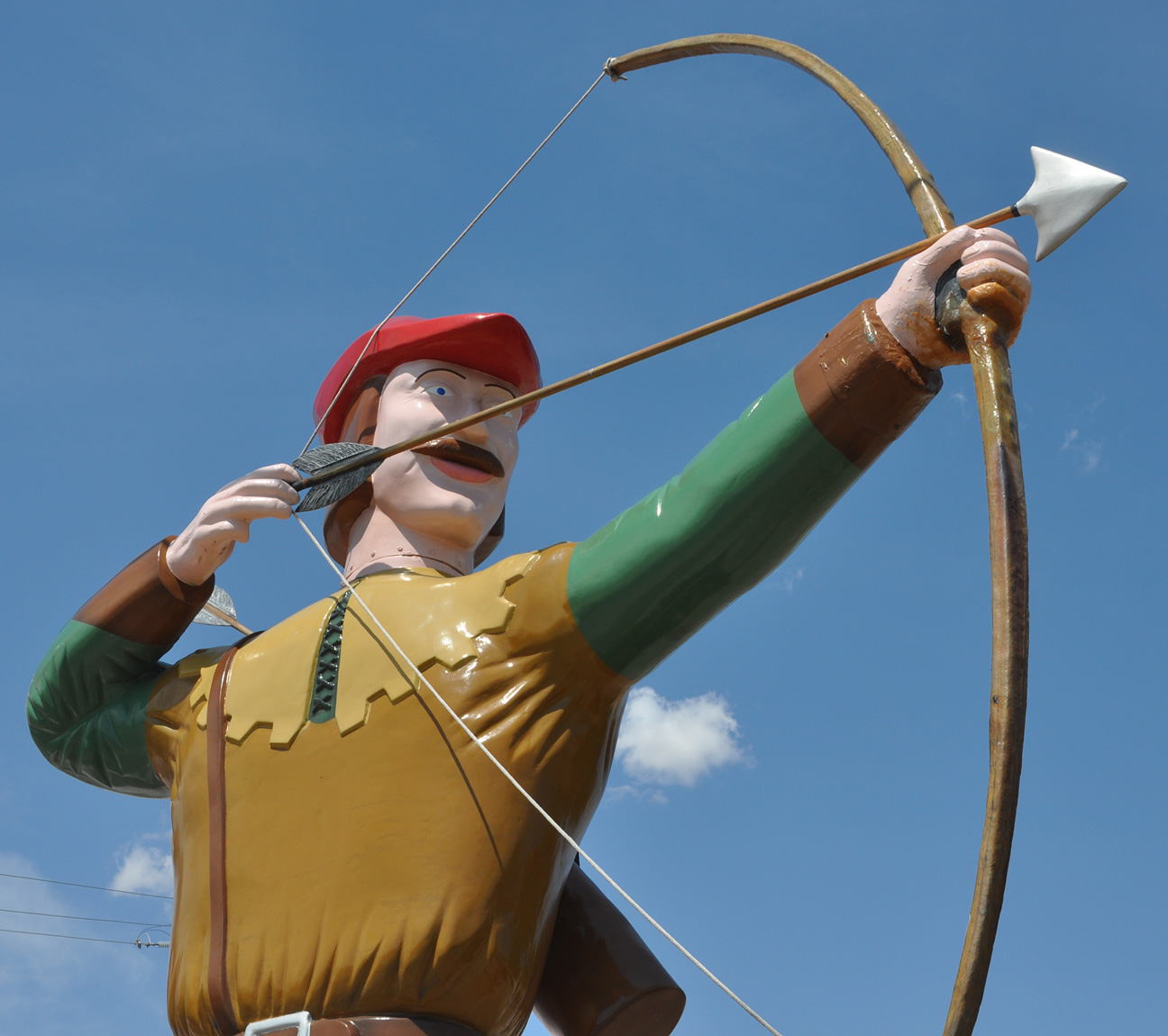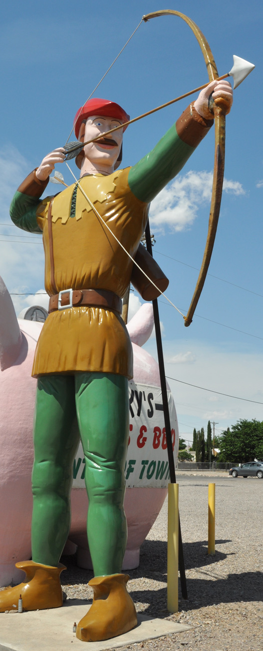 The Robin Hood and the other statues are located across the street from Sparky's restaurant. The Robin Hood was installed here in 2015. His move to Hatch was the subject of a Shipping Wars episode. In 2024, he fell forward and his foot and bow were damaged. He was put in storage until he can be restored and put back on display. There are other Robin Hood statues like this in Colorado Springs, CO and Lake George, NY (gone). They were produced by Ben Robinson for the Plycrete Mold Co. of Elk Rapids, MN. The anthropomorphic Chile Couple and the Yogi Bear statue were created by Mark Cline. Cline may have built the Robot as well. The Piggy Bank was located on the west side of town in 2010. The Big Boy statue is located across the street in front of an antiques store. It appears to be a copy. [map] |