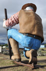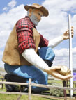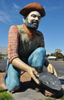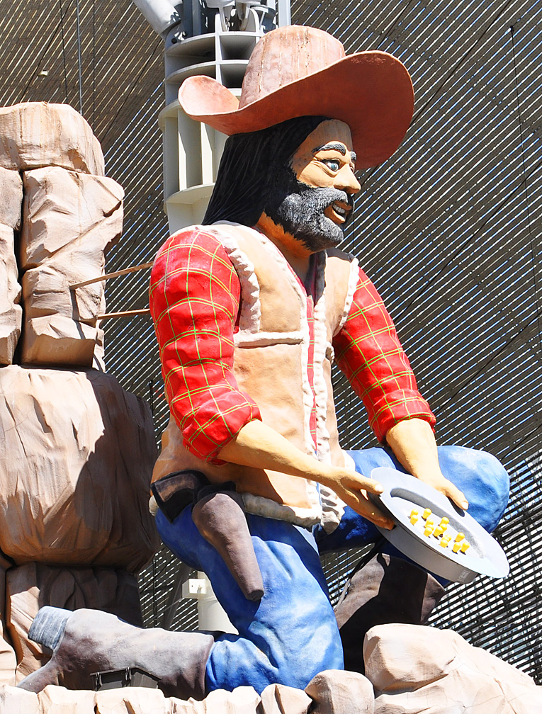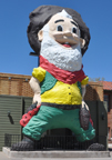| Last Chance Joe is a 36-foot-tall miner statue. It was created in 1952 by Roscoe "Duke" Reading for R.H. Grosh Scenic Studios in Los Angeles. Grosh Scenic Studios created many figures for Disneyland. In 1958, Last Chance Joe was trucked here and installed at Dick Graves' Nugget Casino, later named John Ascuaga's Nugget Casino. Shortly after these photos were taken in 2014, the Nugget was sold to Global Gaming and Hospitality which was no longer interested in keeping the statue. It was donated to the Sparks Heritage Museum. The statue was moved in front of the museum and is now painted the original colors. Although he is sometimes referred to as "Nugget Sam", the correct name, from the beginning, is Last Chance Joe. For more, see these websites: 1, 2, and 3. [map] |