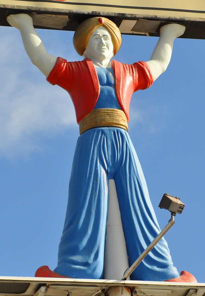 The Carpeteria carpet store chain was established in 1960 in Santa Clarita, CA. The first locations were located in the Los Angeles area. I believe the stores only existed in California and Nevada. I believe these genie icons were used in Carpeteria's advertising and in conjunction with their signs from the beginning. The company folded in 1999. These statues are about 20 feet tall and have identical faces on both sides. The statue's hands originally supported a Carpeteria sign with a graphic representation of a roll of carpet. I believe there are only five of these statues left. In addition to these Reno and Las Vegas locations, there is one in North Hollywood, CA and two statues at the American Sign Museum in Cincinnati, OH. For more, see this website.