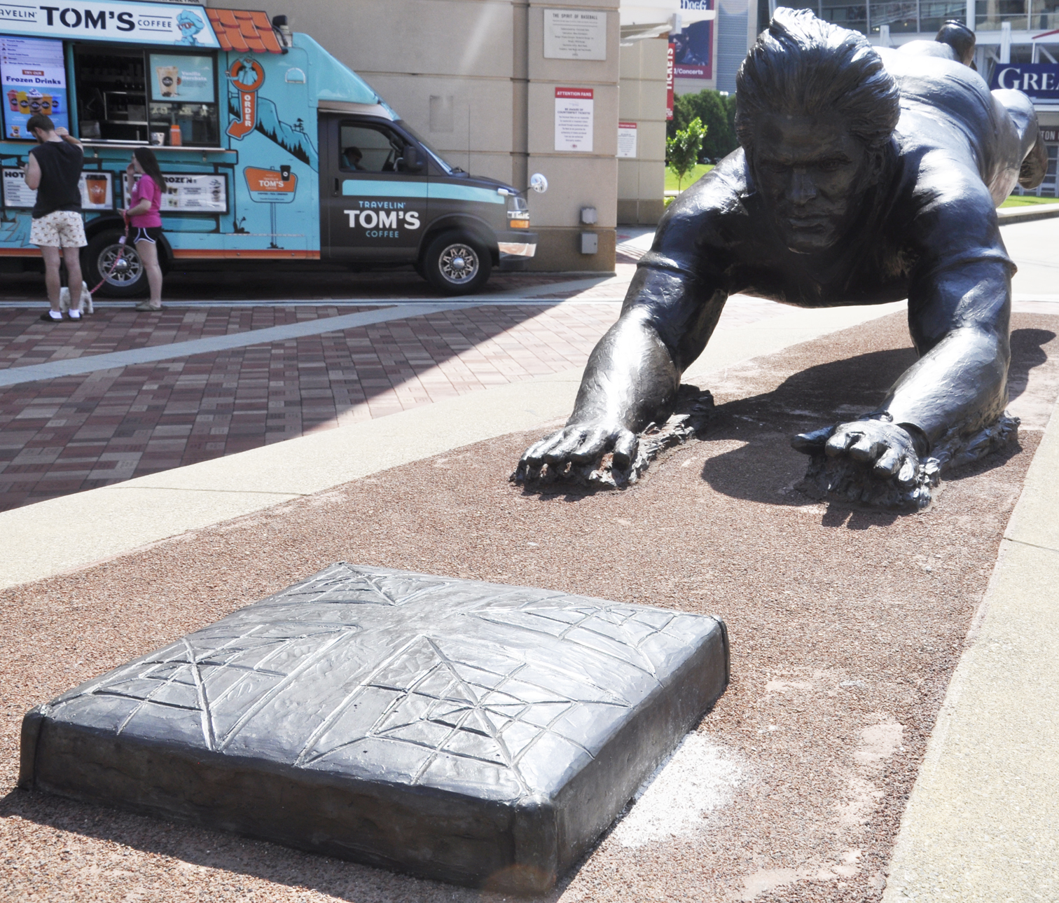 | This bronze sculpture of Pete Rose depicts the Cincinnati Reds baseball player sliding into base. It was created by Tom Tsuchiya and installed in 2017 in front of the Great American Ballpark. There are several other sculptures of baseball players here. [map] |