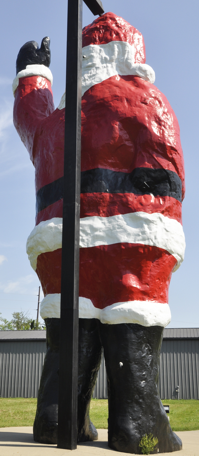 | This Santa statue is 34 feet tall and was built in 1974. It was originally installed in front of the Old Vanderburgh County Courthouse in Evansville. The statue stood in front of the former Busler Truck Stop which was still open when these first photos were taken in 2006. In 2008, the property was sold and the truck stop closed. By 2010, the statue's paint had faded considerably and his body was home to hundreds of pigeons. In 2012, the buildings on the lot were demolished and the Santa statue was moved to a junkyard. In 2016, the statue was restored and put on display at Peckenpaugh Plumbing. For more, see this website. [map] |