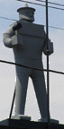 The Tin Man in Sebastopol was created by John Jordan between 1948-1950 for King and Jordan Sheet Metal Work. The sculpture is known as "Jordan's Squire". The seated man is installed on the roof. He holds an apple in one hand and a chicken in the other. The business later became Glenn's Metal Works. I believe that business is gone but the sculpture remains. [map] |