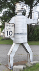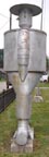 The 15 foot tall Tin Man in Goshen stands in front of the Good Time Stove Company. He was built in 1958 and was originally installed at Hampshire Engineering Service, a home heating oil company in Northampton, MA. When the company closed in 1977, Elbert Ulshoeffer bought him for $150 and installed him at his home in Goshen. Ulshoeffer later sold him to the Good Time Stove Company. He has been here since at least the mid-1980s. His heart, which is illuminated with a lightbulb behind it, was installed around 2000. The Tin Man holds a hammer and cutting shears. This business also sells antique stoves. For more, see these websites: 1, 2, and 3. [map]