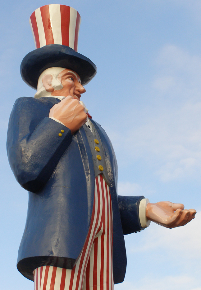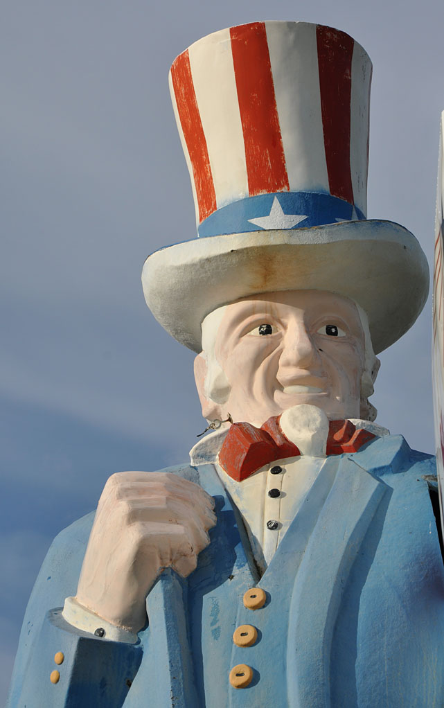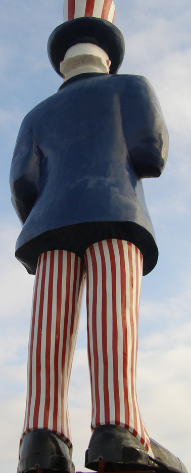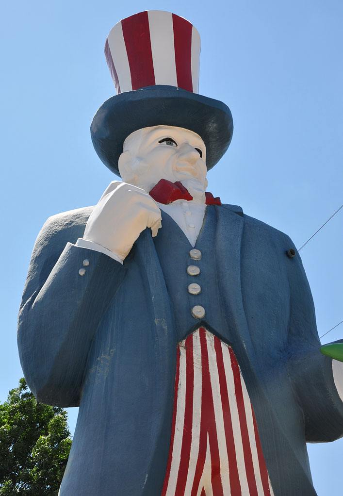 The Uncle Sam in Evansville stood in front of an All-American Car Wash. The statue was raised up on stilts. These photos are from 2006. By 2011, the statue was gone. Does anyone know what happened to it?