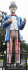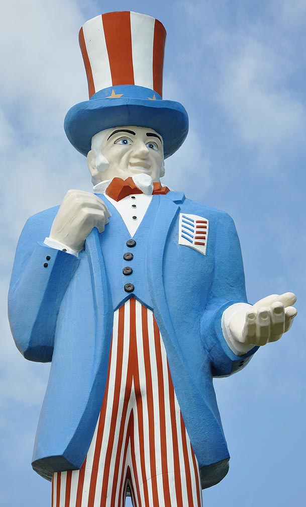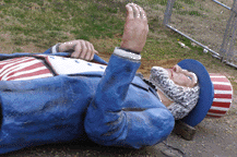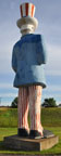 | This Uncle Sam stood in front of Spencer's Antiques in Waynesville, OH when the top photos were taken in 2005. In 2006, the statue was sold on eBay for $10,000 and moved to Hatch, NM. It laid on its back in an empty lot for a few years. It now stands next to Sparky's restaurant. This Uncle Sam holds a chili pepper which is what Hatch is known for. Sparky's has many other fiberglass statues of people and animals. [map] |