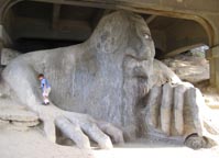 | The Fremont Troll was built in 1990 from two tons of concrete. The sculpture is about 17 feet tall and is installed under the Aurora Avenue Bridge. It was created by Steve Badanes, Will Martin, Donna Walter and Ross Whitehead. The statue holds a real but disguised Volkswagen Beetle in his hand. For more, see these websites: 1 and 2. [map] |