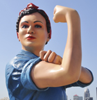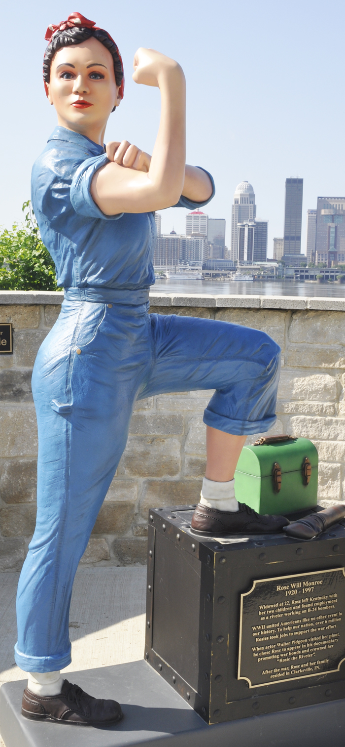 | This Rosie the Riveter sculpture was installed in 2022. Rose Will Monroe was one of four "official" Rosie the Riveters during World War II. She worked at a Michigan aircraft factory. After the war, she settled in Clarksville. For more, see this website. [map] |