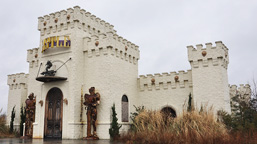 | The Castle of Muskogee features a Renaissance Festival, Halloween and Christmas Festivals, and other special events. Castle-like features were added to a warehouse building starting in 1995 for the first Oklahoma Renaissance Festival. There are other castle-like buildings on the 60-acre property. The tops of the East Gate turrets in the 2012 photo are gone now. There was still one left in 2024. For more, see these websites: 1, 2, and 3. [map] |