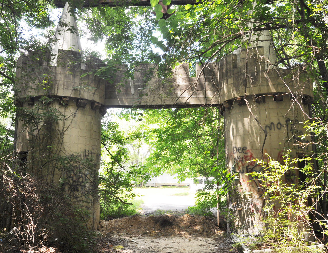 | The Royal Land amusement park opened in the late 1960s with a collection of second-hand rides. It closed in the early 1970s. The name came from the owner, Lloyd Royal. This twin-turret entrance is all that remains of the place. [map] |