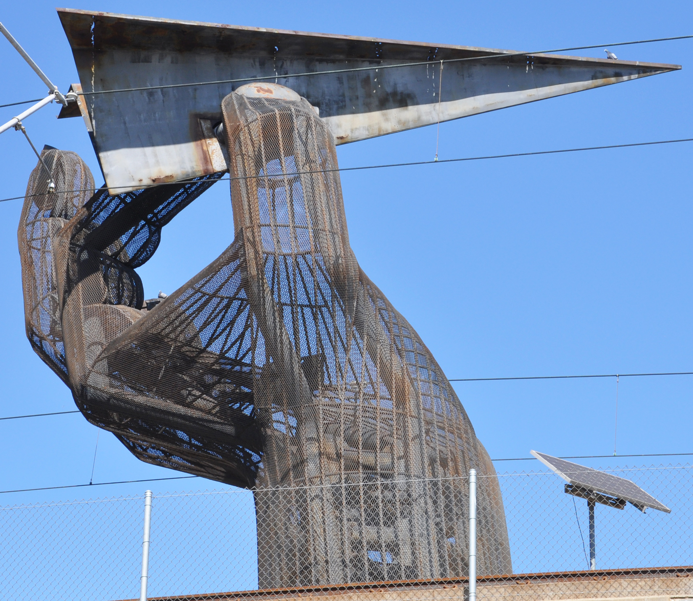 The Hand Holding Paper Airplane sculpture is 26 feet tall and made of wire mesh. It is entitled "For Your Intellectual Entertainment" and was created by Daniel Martinez in 1995. The sculpture is installed on the elevated platform at the El Segundo Metro Green Line Station. [map]