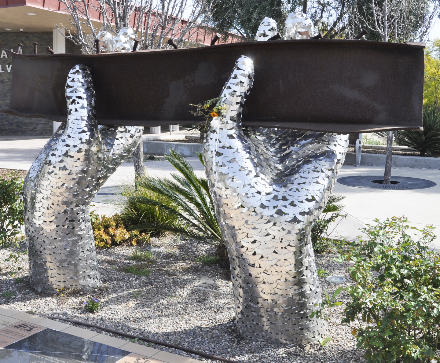 This September 11 Memorial was created by Heath Satow and installed in front of City Hall Plaza in 2017. Entitled "Reflect," it features two stainless steel hands made from 2,976 doves representing the victims in the attack. They hold a steel beam from New York's World Trade Center. [map]