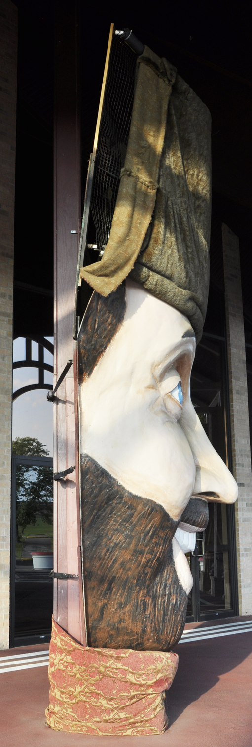 | Pilgrim's Pride, a poultry producer, was founded in 1946 by Bo Pilgrim. In the late 1960s, a pilgrim's hat, Bo's trademark, was mounted on the roof of Pilgrim's Place, a restaurant in downtown Pittsburg. When the restaurant closed in 2001, the hat was put in storage. In 2002, the company commissioned a 37-foot-tall fiberglass bust of Bo on which to display the hat. The bust was installed in front of their freezer and distribution plant. In the gazebo under the bust, there is also a bronze statue of Bo Pilgrim reading the Bible with his chicken, Henrietta. In 2010, it was announced that Pilgrim's Pride was moving its headquarters to Greeley, CO. In 2019, in advance of the move, the head and statues were removed. The smaller statue will be displayed at a bank in town. The disassembled head is now in storage. For more, see these websites: 1 and 2. |