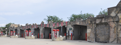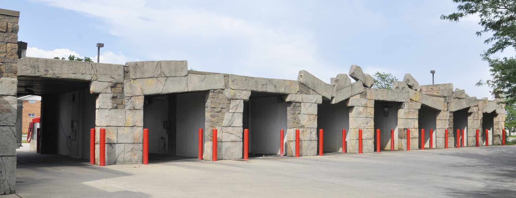 | The Rainforest Car Wash had opened by 2004. It featured Mayan ruins, swinging monkeys, animatronic elephants, with thunder and animal sound effects. A giant head moved his eyes from right to left and bellowed things like "watch out for the gorillas!" followed by an evil laugh. The car wash closed in 2012. It is now known as Wash That Ridge. Much of the Mayan details, phony foliage, and the statues have been removed. [map] |
