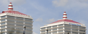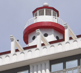 | Waterfront Plaza features twin lighthouses with one on top of each tower. They were built around 1993 and can be considered true lighthouses since they are used for orientation by airplanes with their functioning beacons. For more, see this website. [map] |