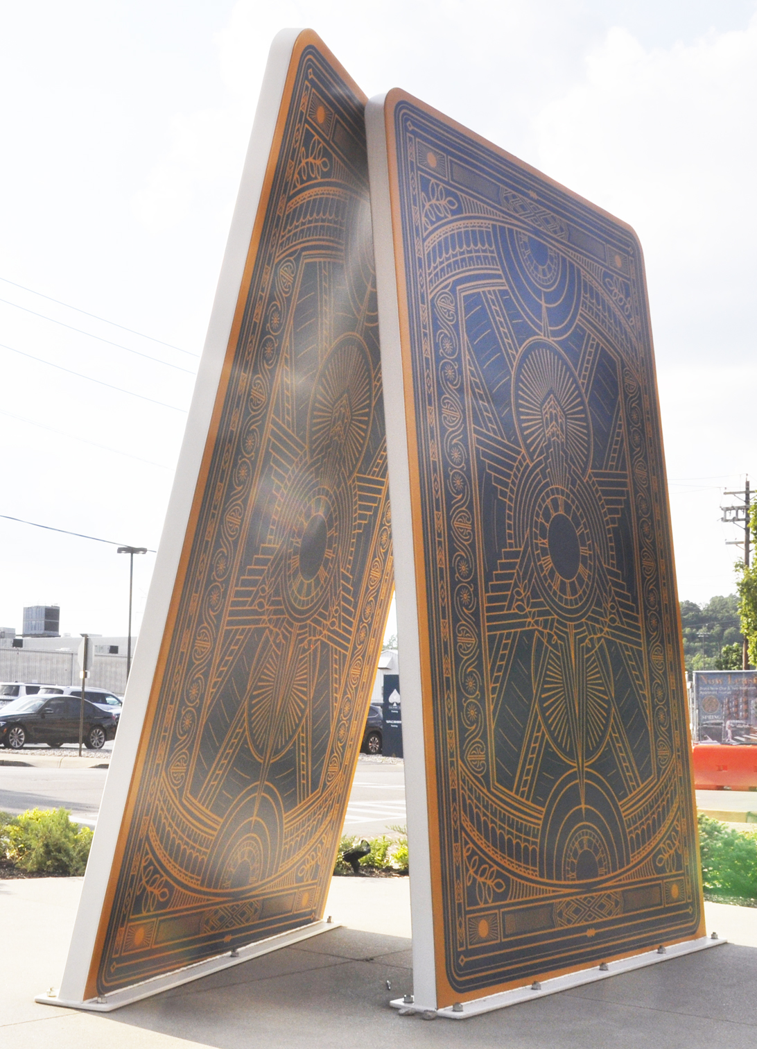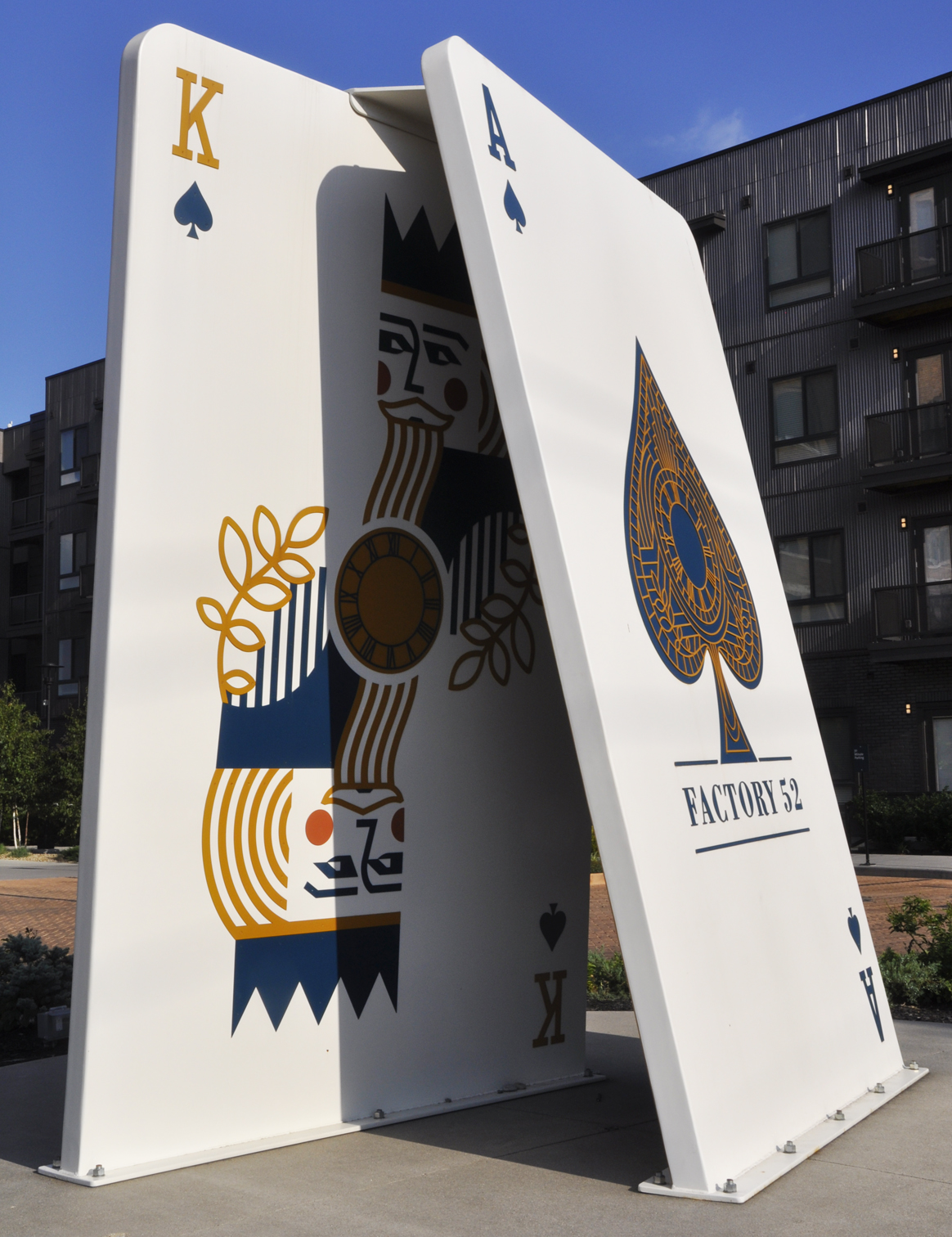 | These Bicycle playing cards were installed in 2023 at Factory 52. The mixed-use development is the former site of the United States Playing Card Company factory. [map] |
