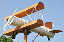 This Giant Paper Airplane in Abilene is about 30 feet long and made of wood. It is located at the Sparhawk Art Gallery and Bed and Breakfast. The Airplane was built by D.R. Sparhawk around 2012. It was modeled after Lance Yang's origami F-15. In 2018, it was damaged in a storm and I don't know if it was repainted. For more, see this website. [map]