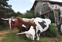 | This Covered Wagon and its pair of concrete oxen were built in 1932 by a pair of missionaries. In 1939, it became part of a souvenir store. It was located next door to the 1733 Ranch (1,733 miles from Boston and from San Francisco) on the Lincoln Highway. In 1951, a fire consumed the covered wagon but the oxen were spared. The wagon was refurbished several times after that. In bad shape by 2002, there was talk of restoring it again but nothing happened. In 2007, the building next to the Wagon was restored. In 2013, the covered wagon and oxen were restored. New canvas was added to the covered wagon. By 2018, the Covered Wagon and oxen were in rough shape again. The building next to it remains vacant. For more, see these websites: 1, 2, 3, and 4. [map] |