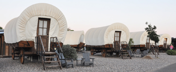 | These Covered Wagons are located at the Yosemite Pines Resort. There are six of them that can be rented as cabins. They were produced by the Conestoga Wagon Co. which has been selling them to campgrounds around the country since 2015. |