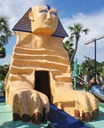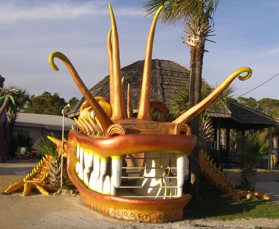 The Panama City Beach Goofy Golf remains virtually unchanged since it opened in 1959. The course includes a Sphinx, an Easter Island Head, a Buddha, a volcano, various monsters, a monkey, a dinosaur, a castle, a rocket ship, and more. Goofy Golf was invented by Lee Koplin who started his empire with a course in Biloxi, MS (now gone). Some of his other courses include those in: Pensacola, FL, Fort Walton Beach, FL, Reno, NV, and Galveston, TX. The earliest known Koplin course still in existence is Pee Wee Golf in Guerneville, CA which was built in 1948.